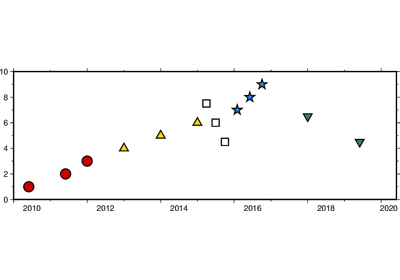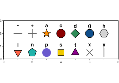 x/y,fillcan be a 1-D array that will be mapped to a colormap.If a symbol is selected and no symbol size given, then plot will interpret the third column of the input data as symbol size. Symbols whose size is <= 0 are skipped. If no symbols are specified then the symbol code (see